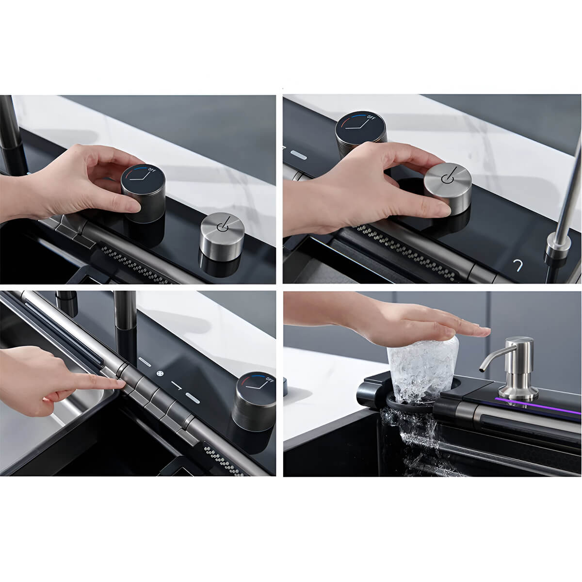 Panoul de control are butoane individuale pentru activarea funcțiilor: baterie, cascadă, waterfall sau clătirea ceștilor. Totul este intuitiv și ușor de folosit.