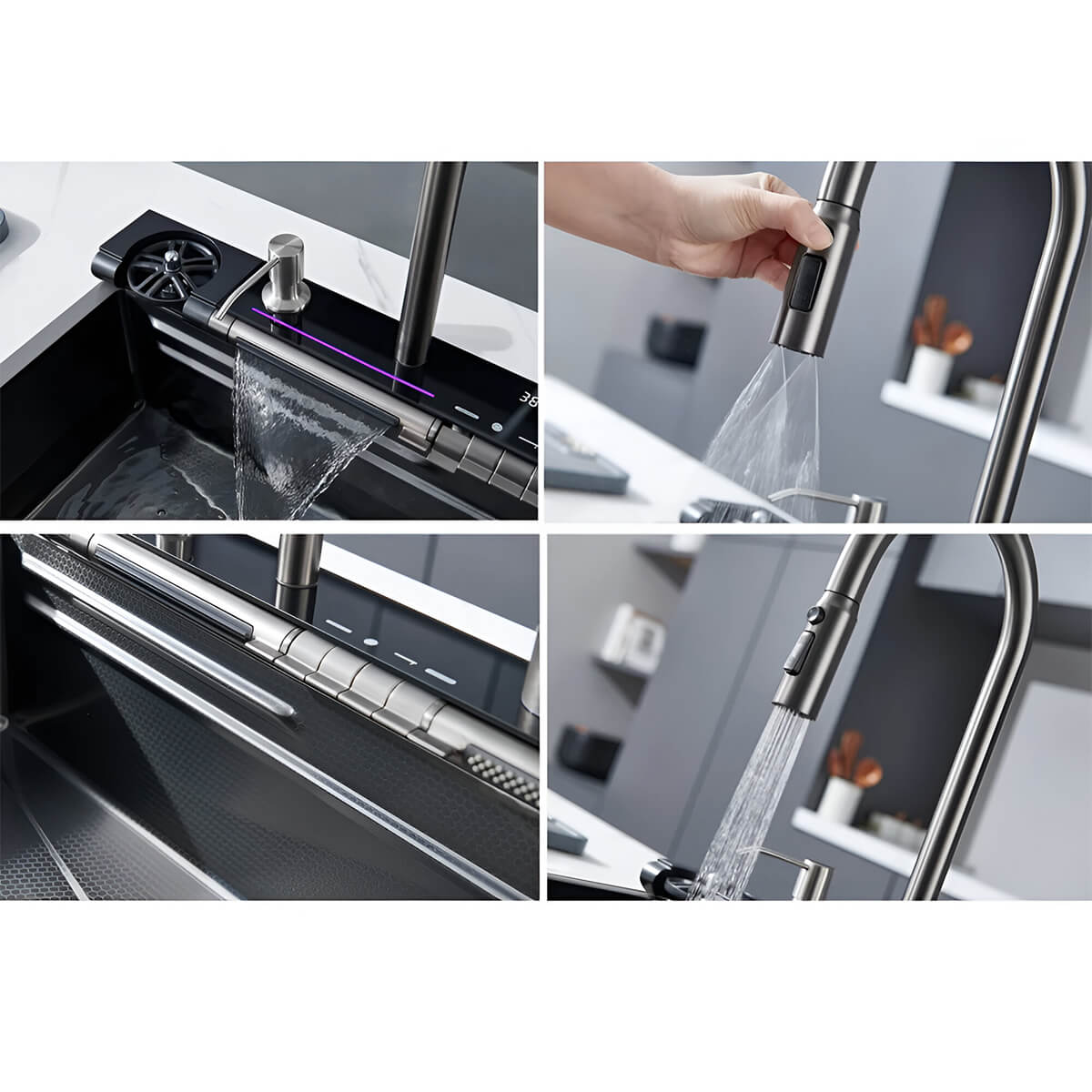 Integrează chiuveta, bateria, cascada frontală și accesorii utile, transformând spațiul de lucru într-un centru complet pentru spălare, clătire și pregătirea alimentelor.