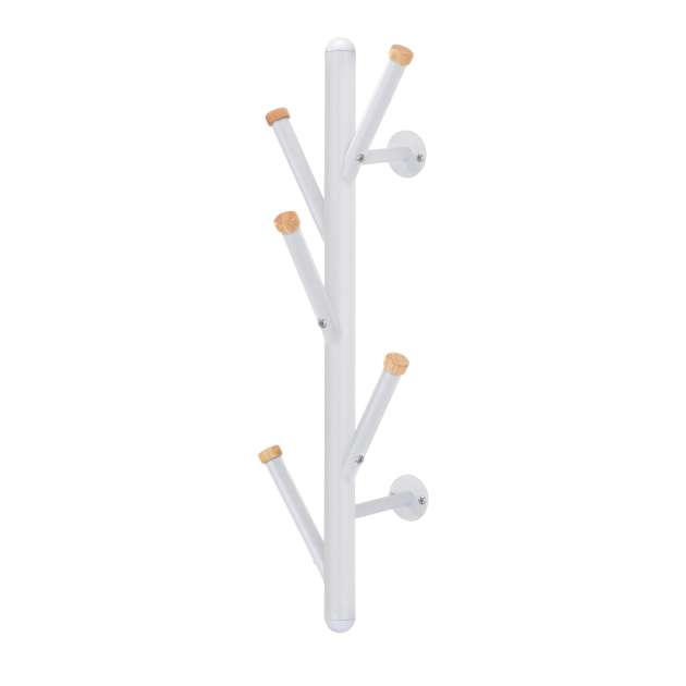 Cuier de perete vertical, realizat din metal vopsit electrostatic. Echipat cu 5 agățători metalice cu elemente din lemn lăcuit.