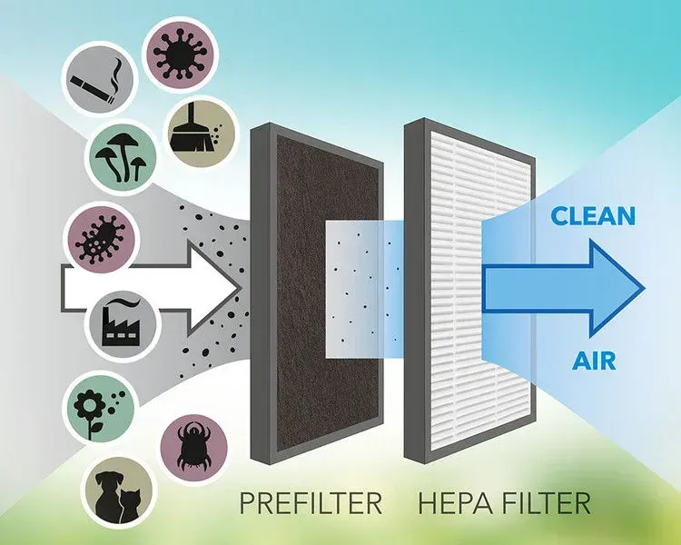 ✔ Sistem dublu de filtrare – prefiltru + filtru HEPA care elimină 95% din viruși, bacterii, spori de mucegai, alergeni și praf.